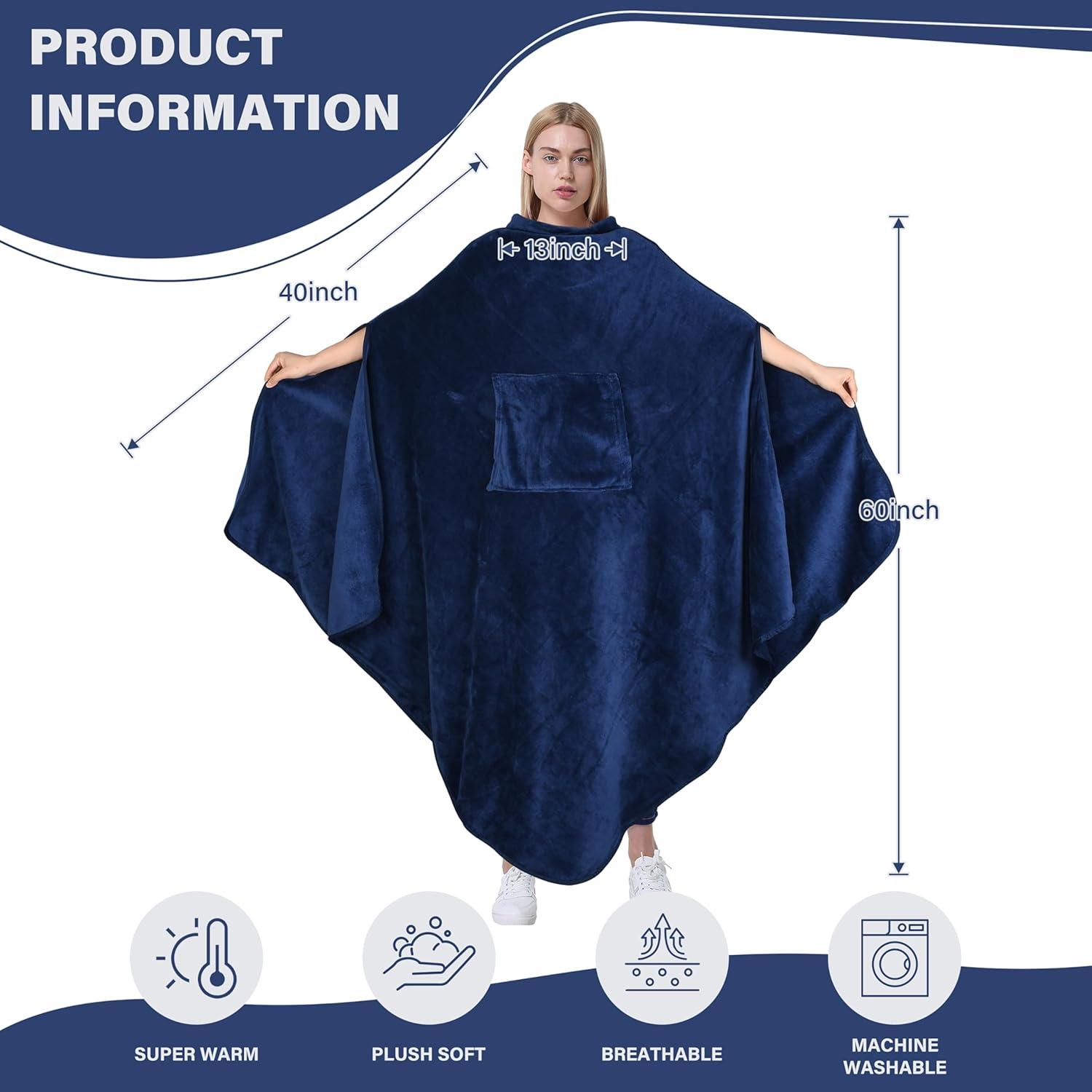 Catalonia Fleece Wearable Blanket Poncho for Adult Women Men, Travel Wrap Blanket Cape with Pocket |Warm, Soft, Cozy, Snuggly, Comfort Gift, No Sleeves|All Season, Grey(Navy)