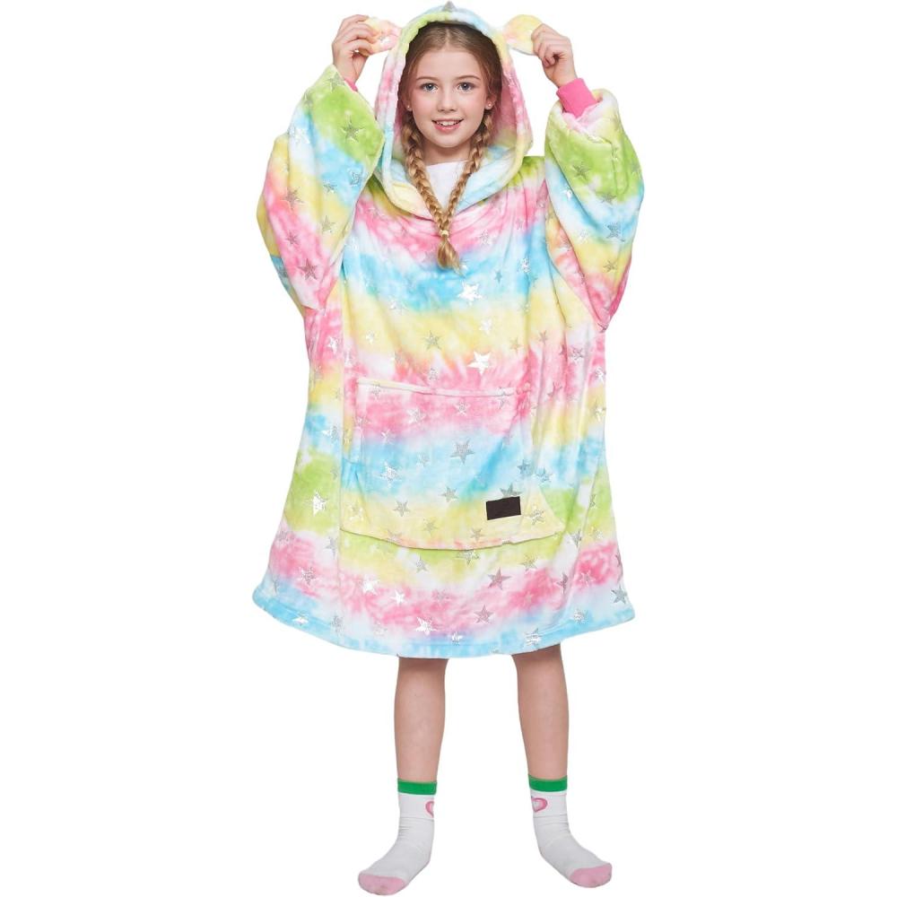 Catalonia Galaxy Blanket Hoodie for Kids, Oversized Fleece Blanket Sweatshirt, Warm Cozy Wearable Hooded Pullover for Boys & Girls(Rainbow Unicorn)