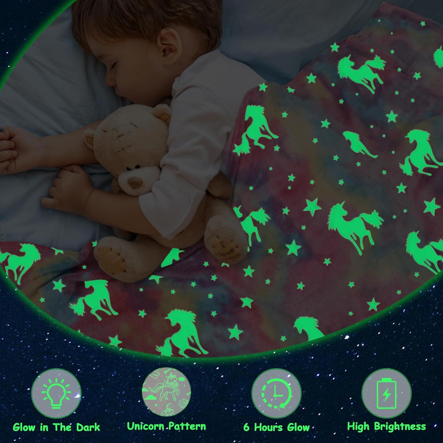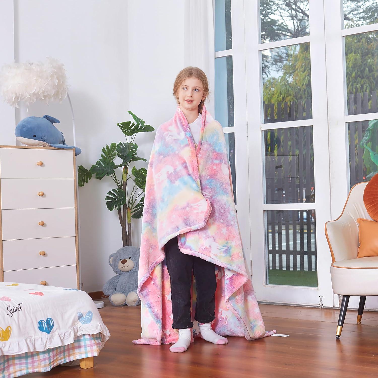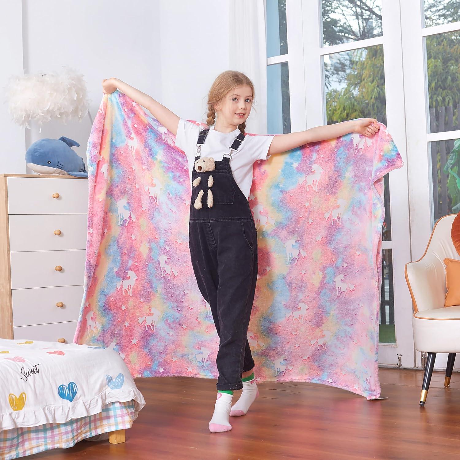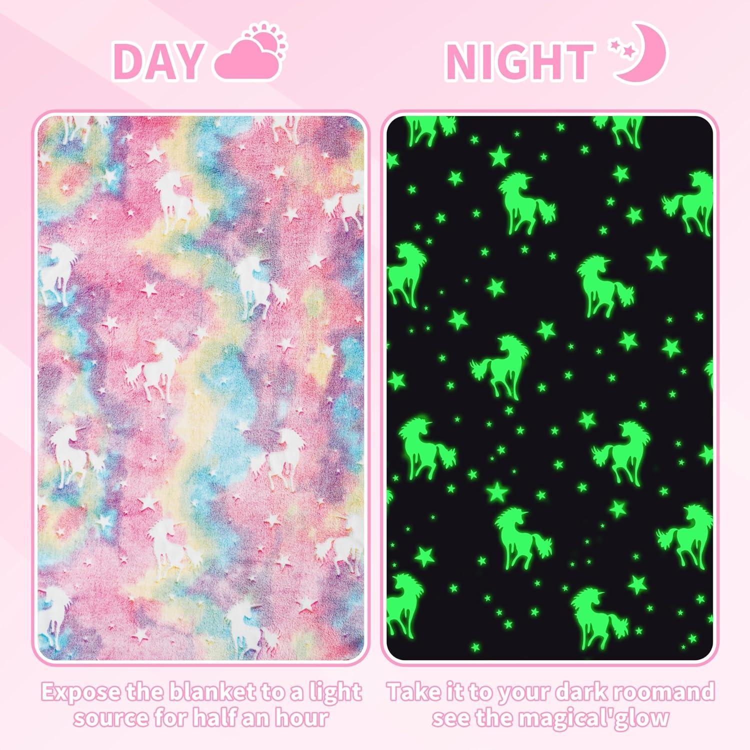 Simply expose our pink unicorn blanket to bright light for half an hour, then turn off the light and the blanket will sparkle in the dark! Covered with a blanket, this is the moment when children can enjoy the fun of blankets!