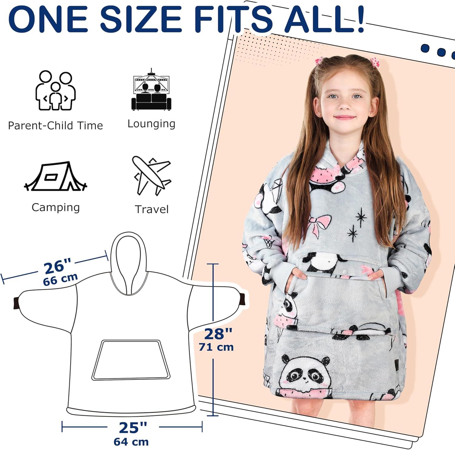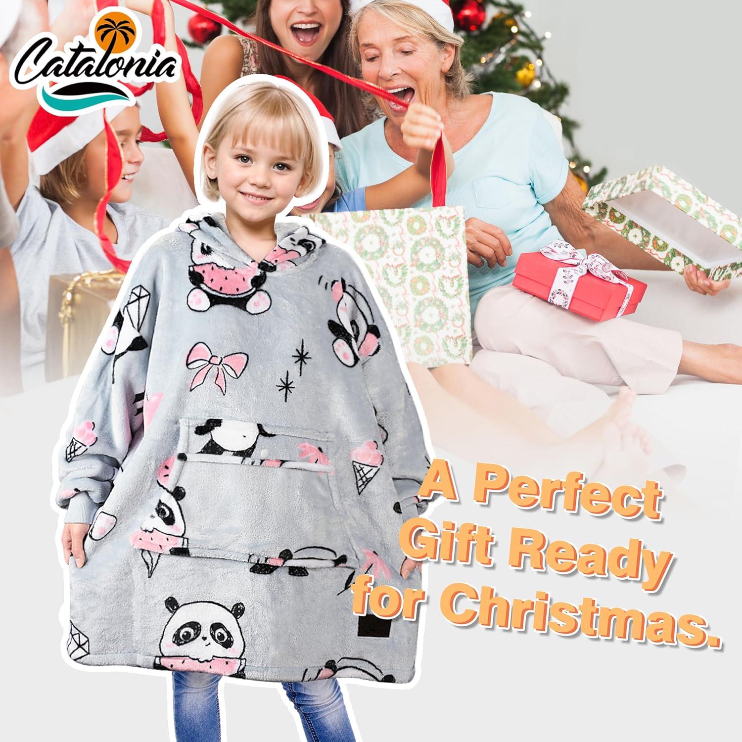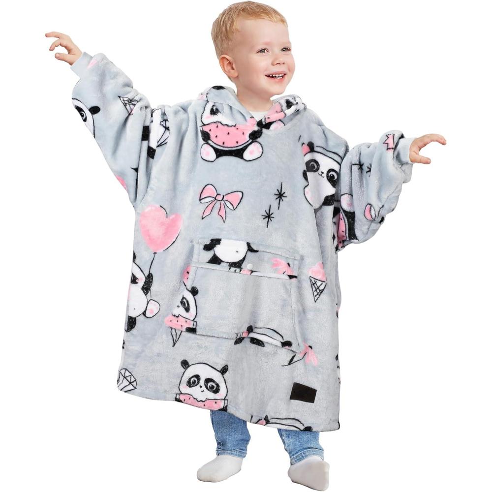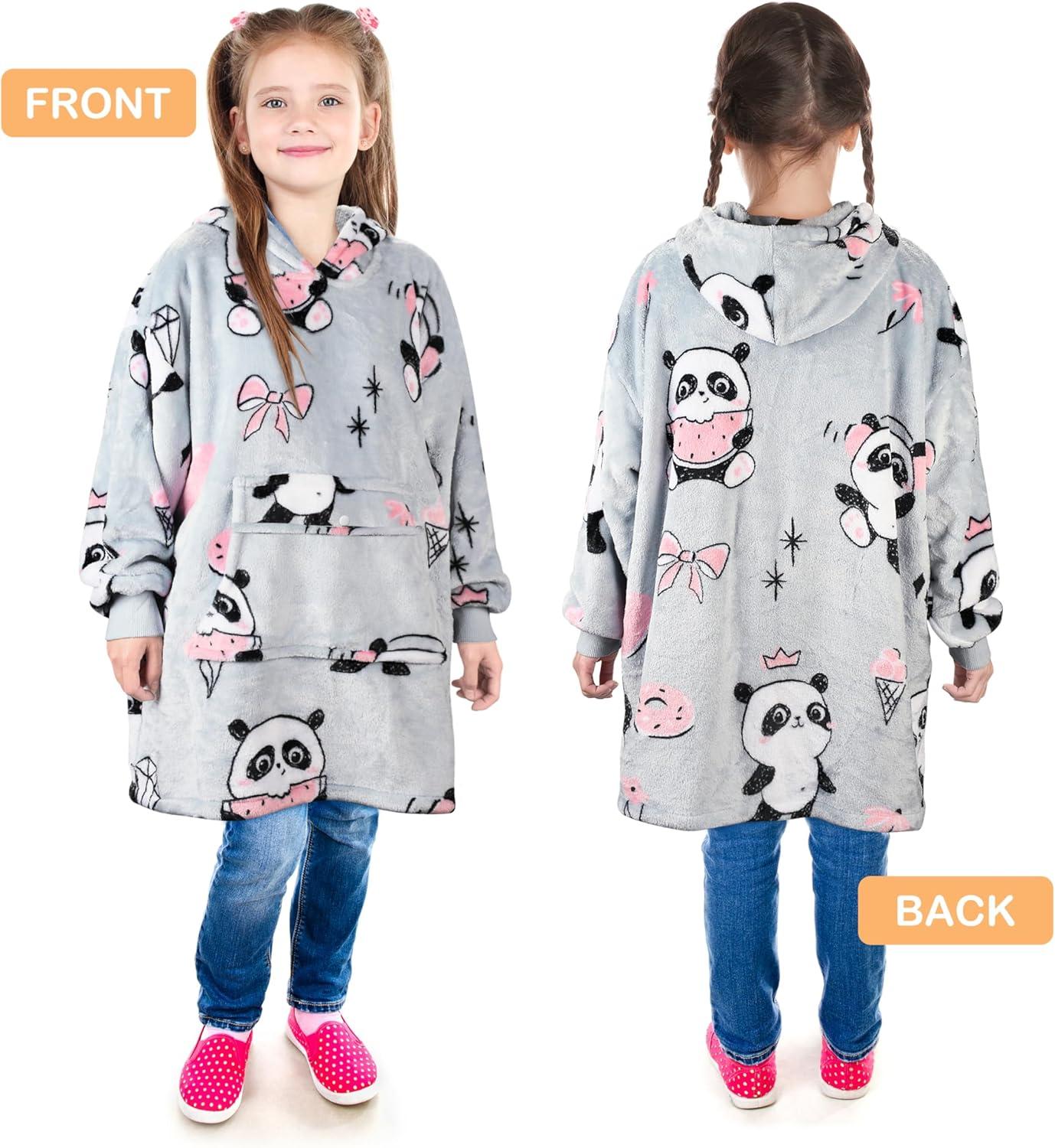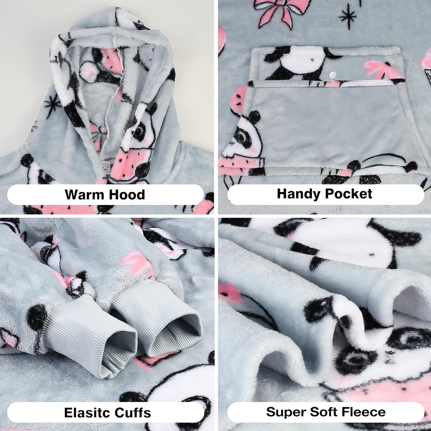 Catalonia Oversized Blanket Hoodie for Kids, Wearable Fleece Sweatshirt Pullover with Large Front Pocket, 4-12 Years Boy Girl(Panda Grey)