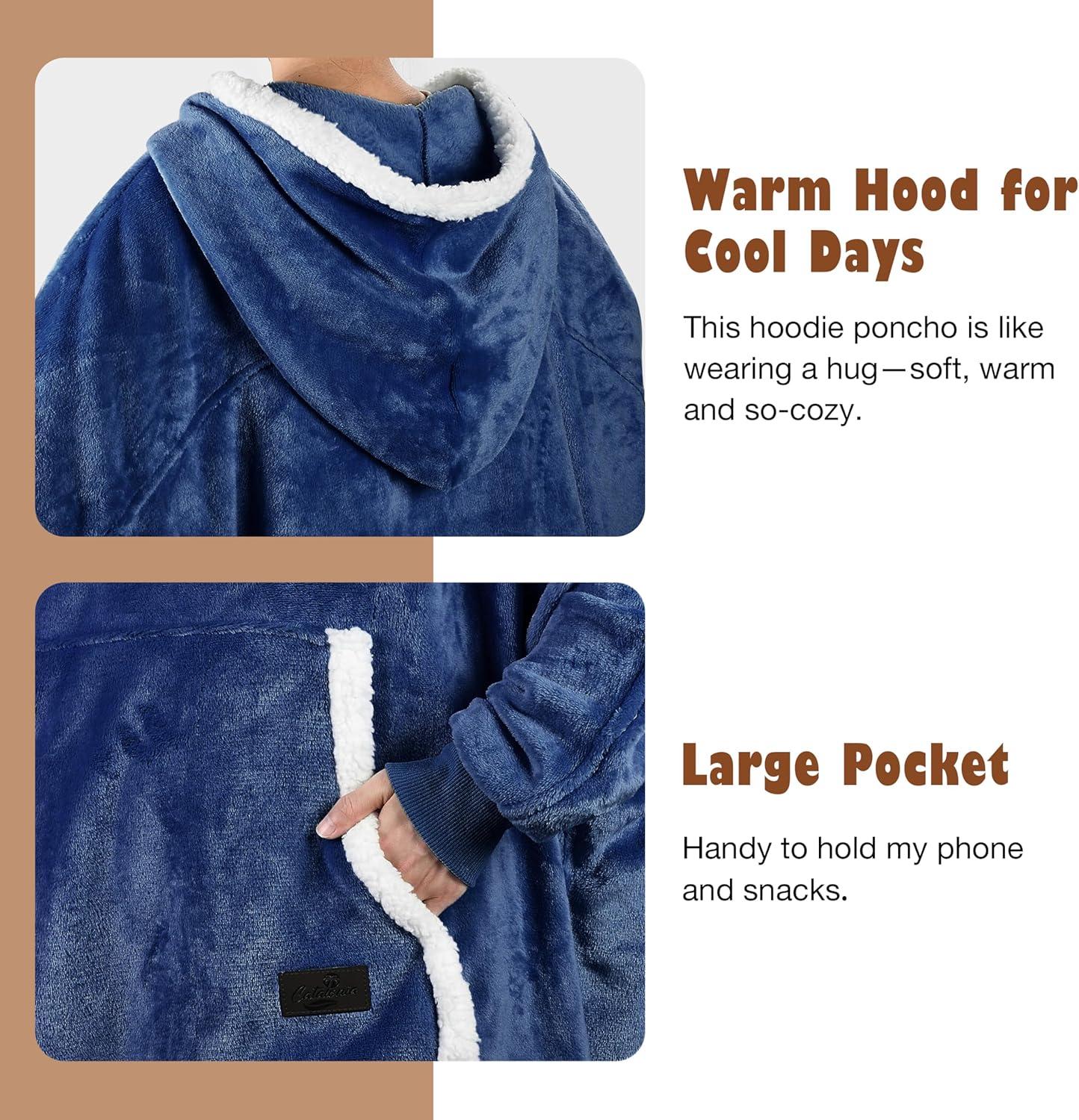 Catalonia Oversized Hoodie Sweatshirt Poncho, Casual Hoodie Cape, Batwing Coat Pullover Blanket, Comfortable, Roomy | Gift for Adults Women(Navy)