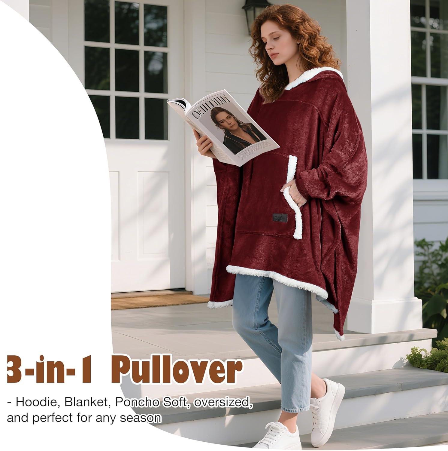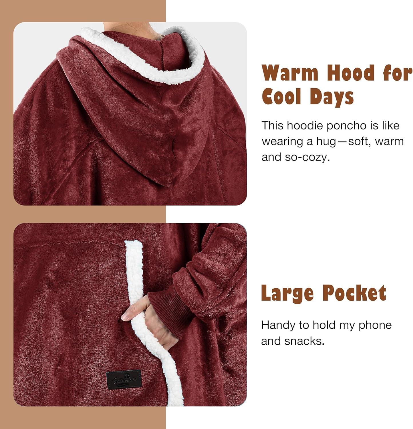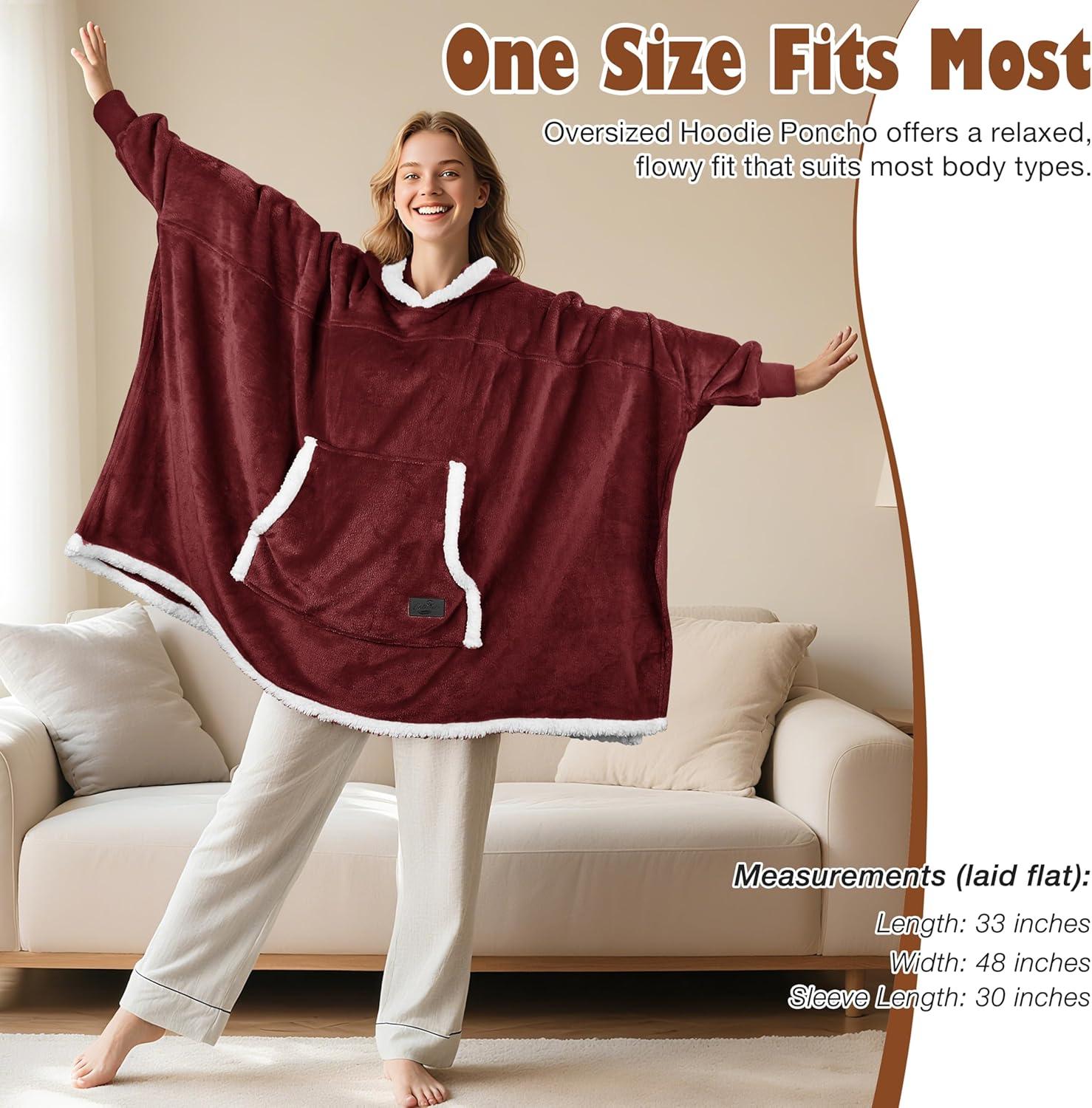 Catalonia Oversized Hoodie Sweatshirt Poncho, Casual Hoodie Cape, Batwing Coat Pullover Blanket, Comfortable, Roomy | Gift for Adults Women(Wine)