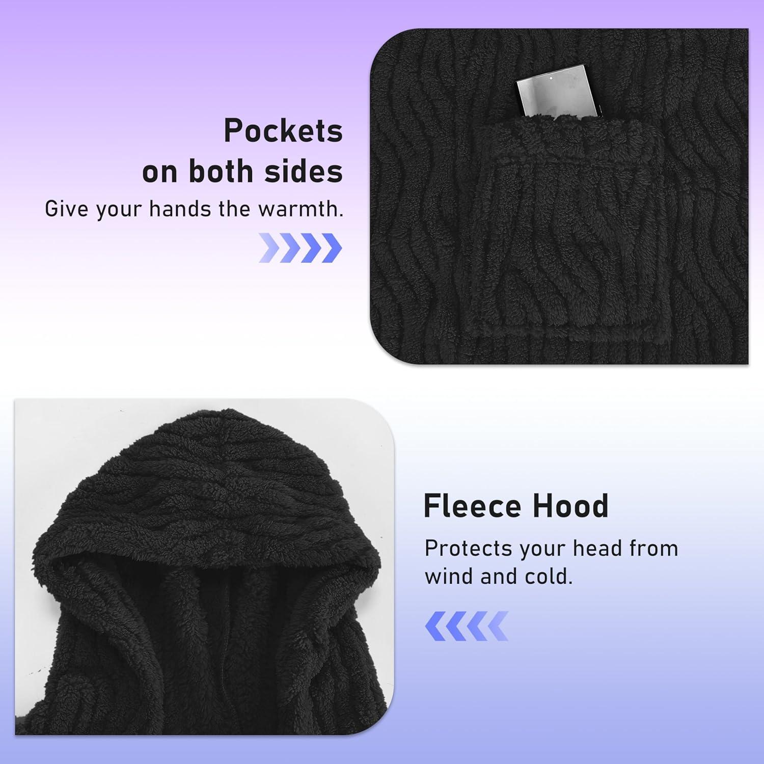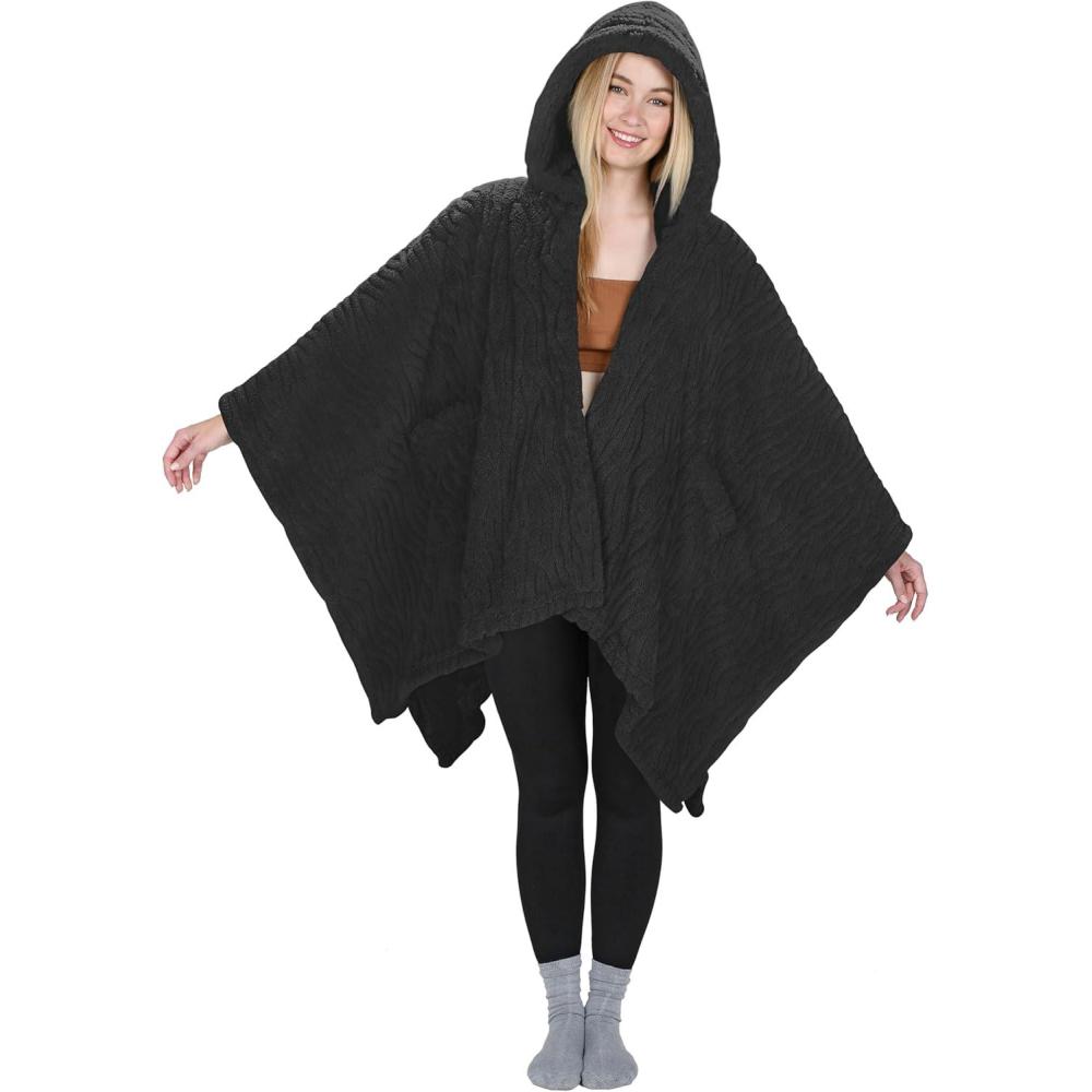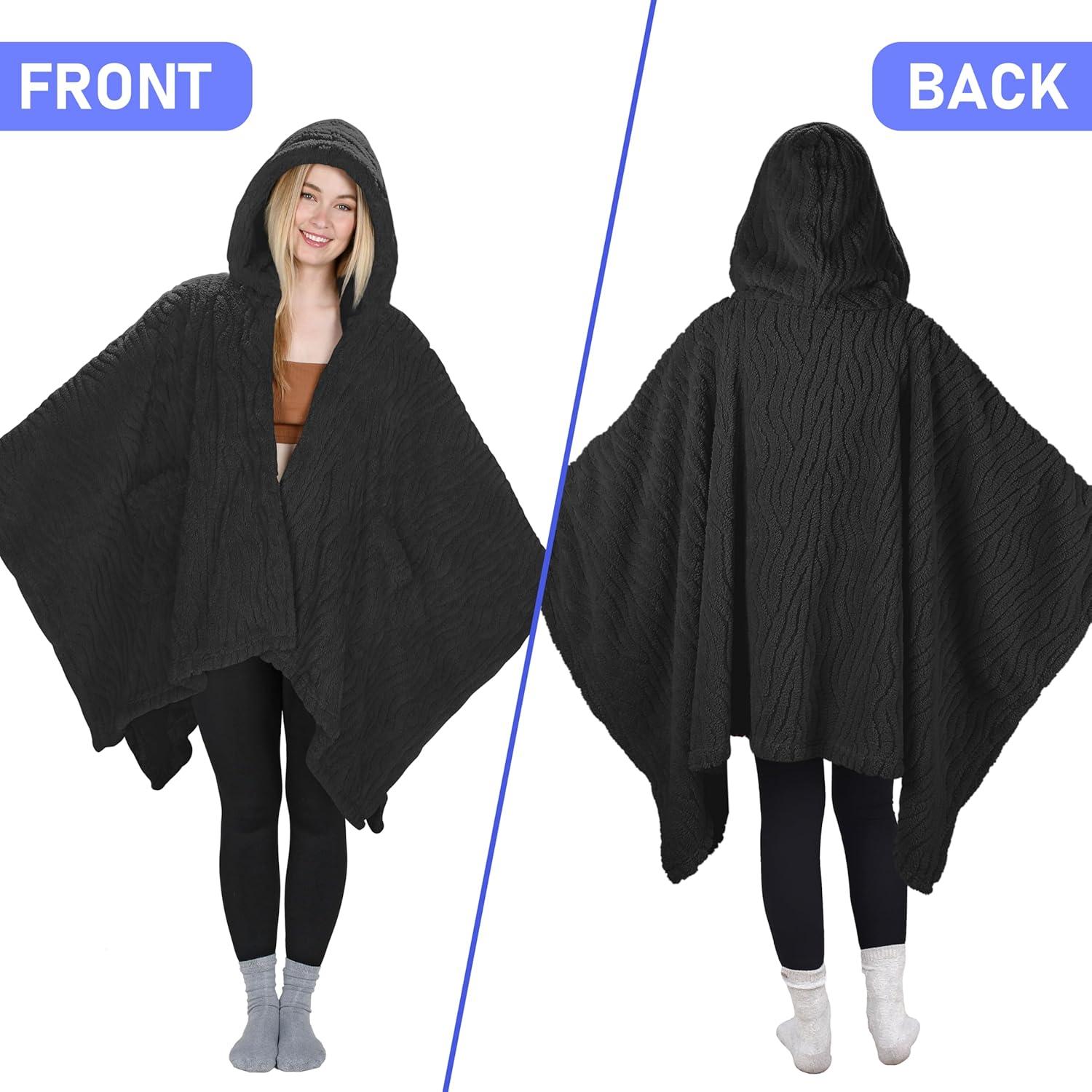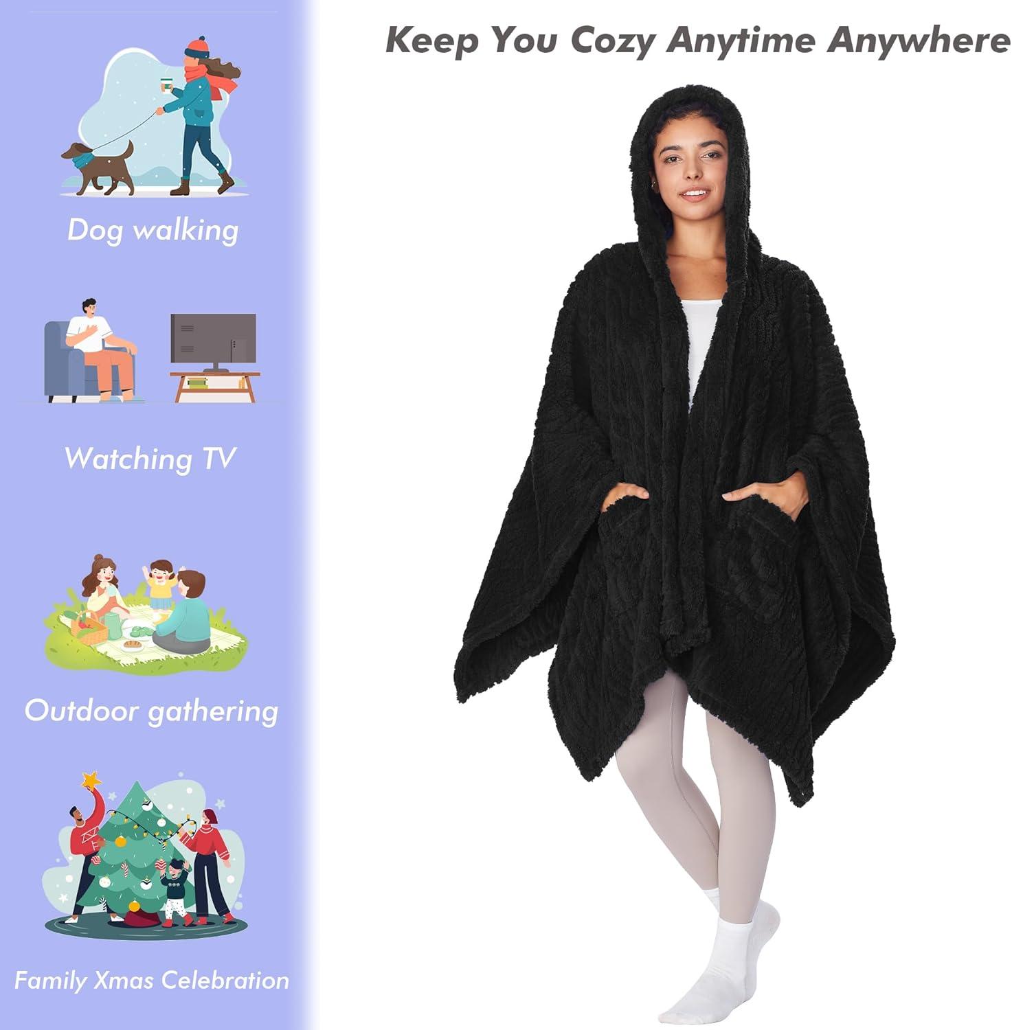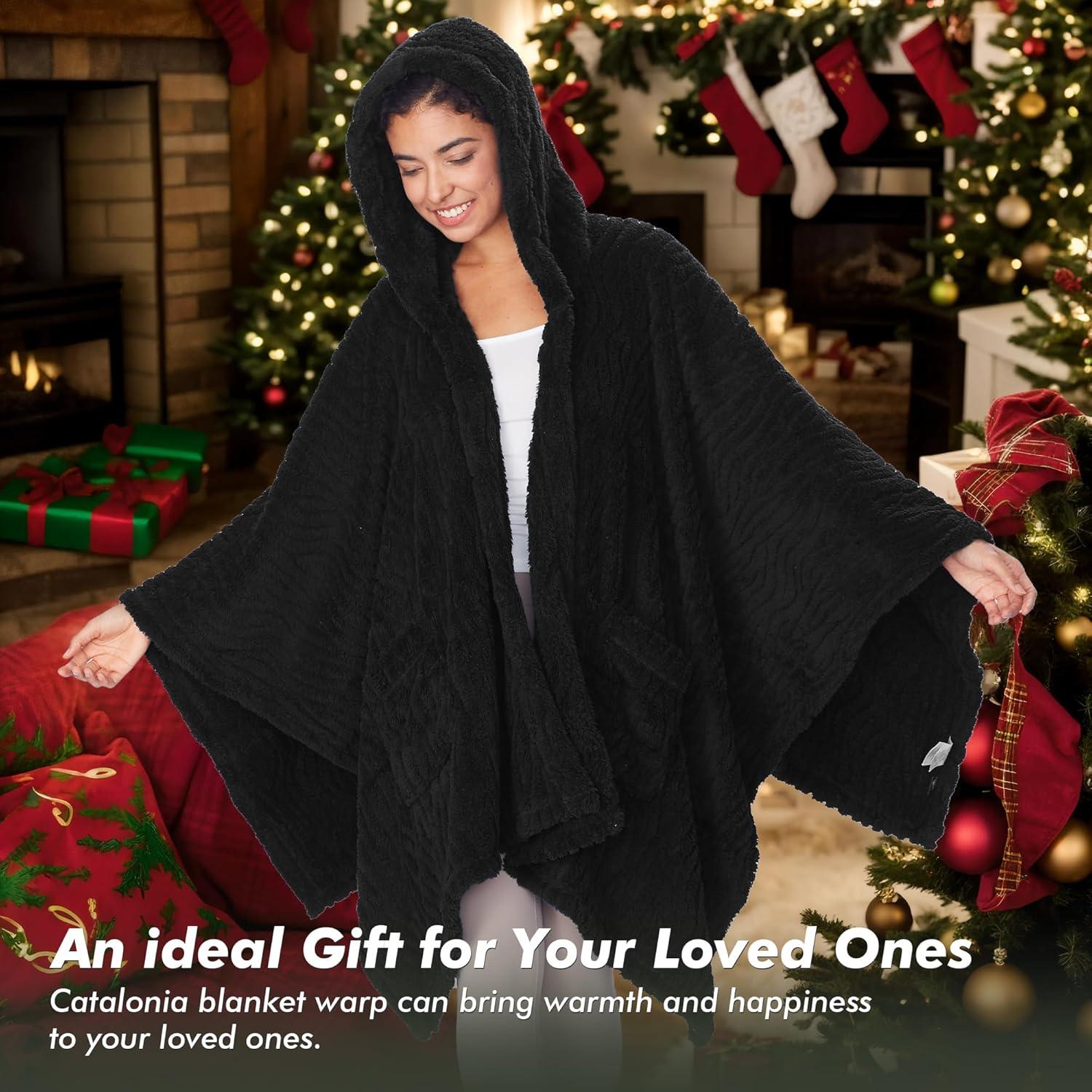 Catalonia Women’s Poncho Cape, Sherpa Cloak Coat, Snuggly Hooded Wearable Blanket, Gift Idea for Mom and Teen Girls(Black)